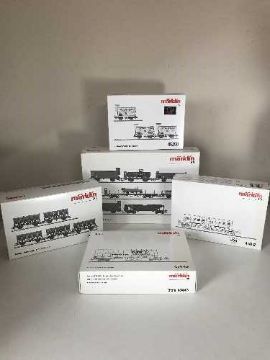 Five Marklin assorted train car sets 47452, 45250, 46353, 46082 and 47443 - H O Scale, all parts boxed.
