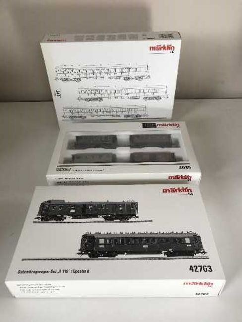 Three Marklin assorted passenger car sets 43108, 42763 and 4035 - H O Scale, all parts boxed.