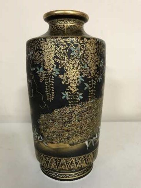 A Japanese Satsuma black and gilt vase, depicting peacocks, with character marks and an old Christies label to base