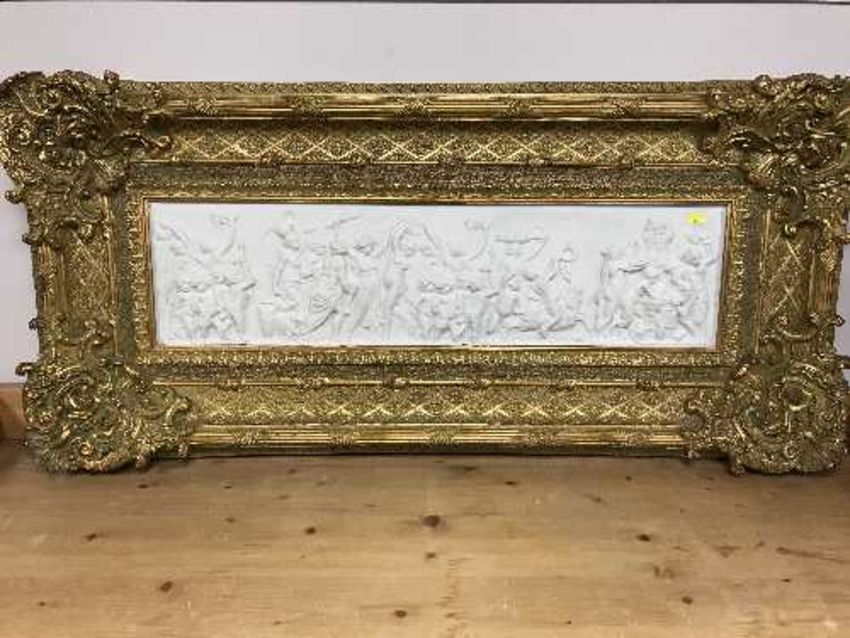 A gilt framed panel depicting figures