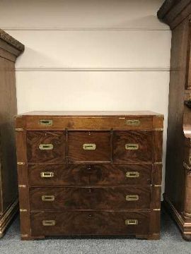 A mahogany campaign-style chest of six drawers around a central drawer, with brass fittings, width 126 cm.