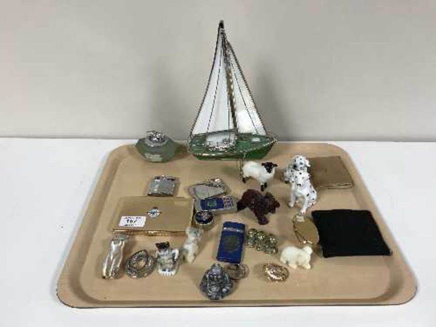 A quantity of lighters including Wedgwood jasperware and Ronson examples, oriental figures, compacts, Beswick sheep, model of a yacht etc (Q)