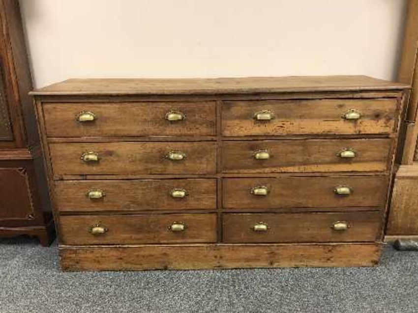A pine draper's side-by-side chest of eight drawers, with brass handles, width 168 cm.