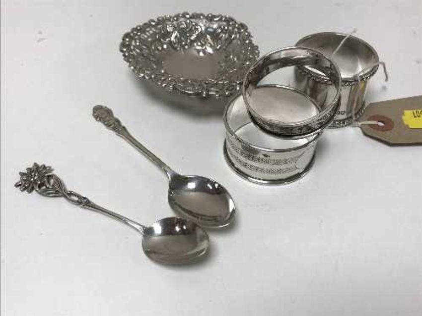 Three silver napkin rings, teaspoons, pierced rimmed heart shaped dish