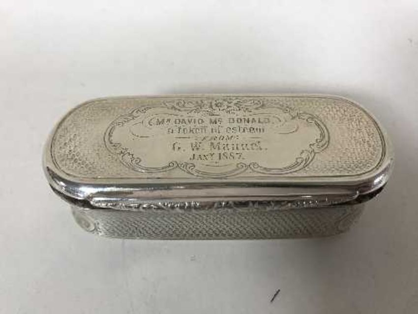 A silver lidded box, length 8.5cm, engraved date 1887