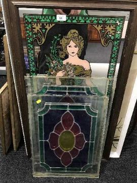 A framed oil, picture mirror, four leaded glass panels, Bagatelle game and a musical table