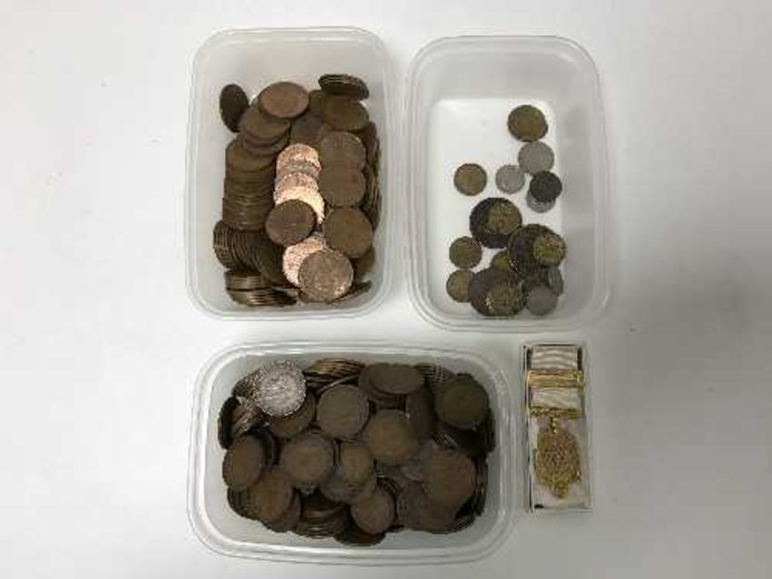 Three boxes of pre-decimal copper coins and a Freemasons medal