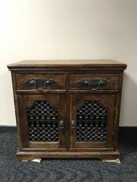 A hardwood display cabinet with metal handles and fittings