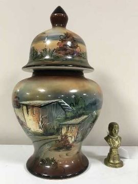 A brass Lord Wellington paperweight and a vase and cover decorated with a landscape
