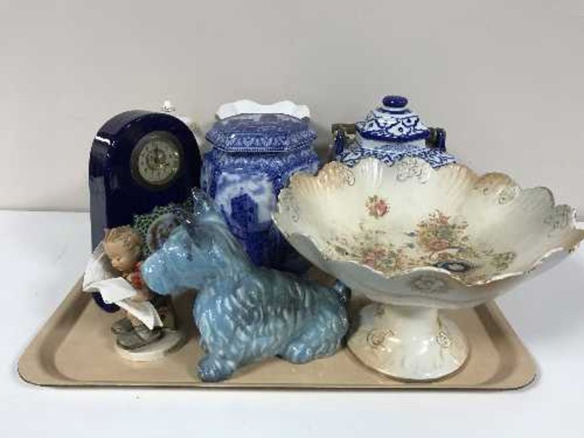 A tray of Goebel figure, pottery West Highland terrier, Ringtons caddy, New Chelsea teapot etc