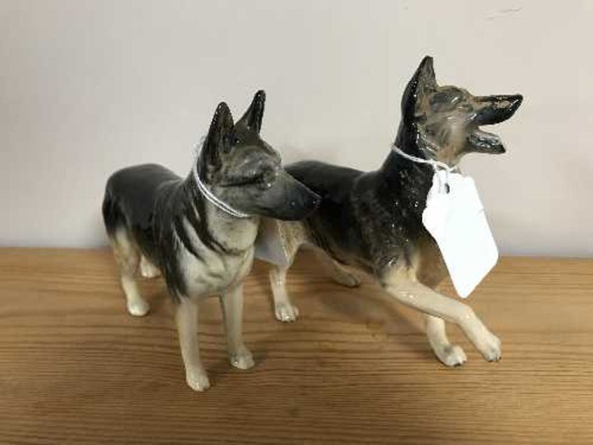 A Beswick china figure : Alsatian "Ulrica of Britas" - Large, model number 969, height 14 cm. 2.4 cm, together with a Royal Doulton china figure : Alsatian (prancing with front right paw raised), height 15 cm. (2)