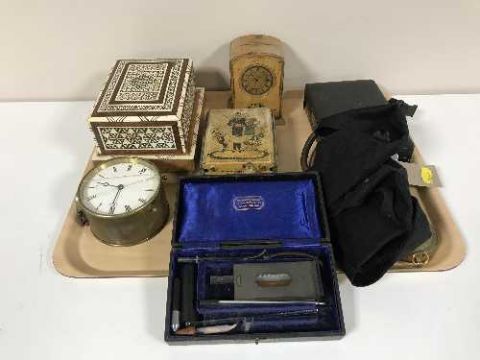 A tray of medical equipment, vintage tin money box, cigarette box, desk clock etc