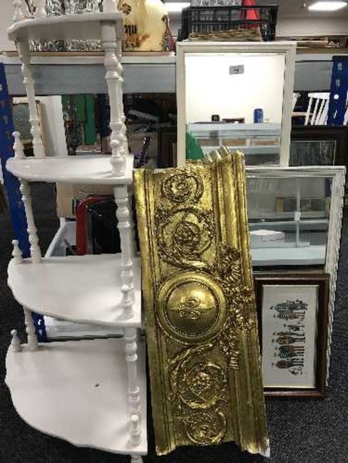 Painted corner what not stand, two mirrors, print and gilt plaster cornice