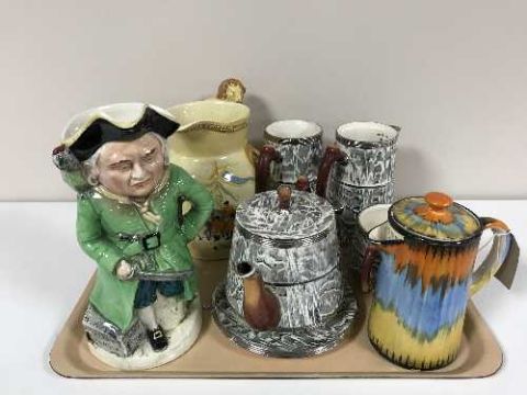 Five piece Arthur Wood silver shield service, Arthur Wood pottery jug, musical toby jug and a Dewley pottery "God Save the King" musical jug