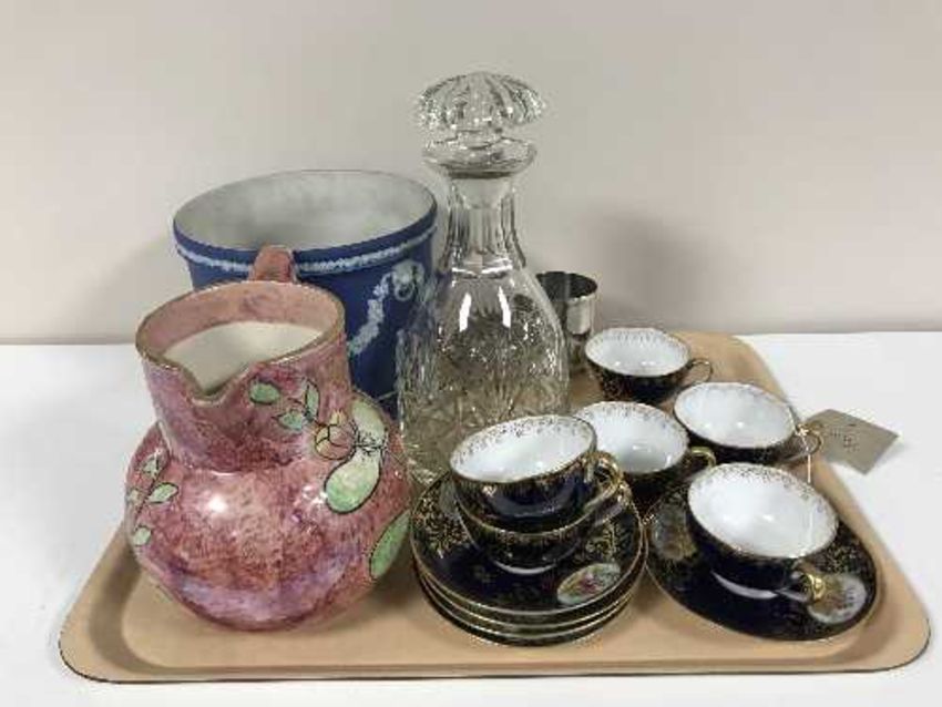 A tray of Jasper ware planter, Kensington ware jug, decanter, cups and saucers etc