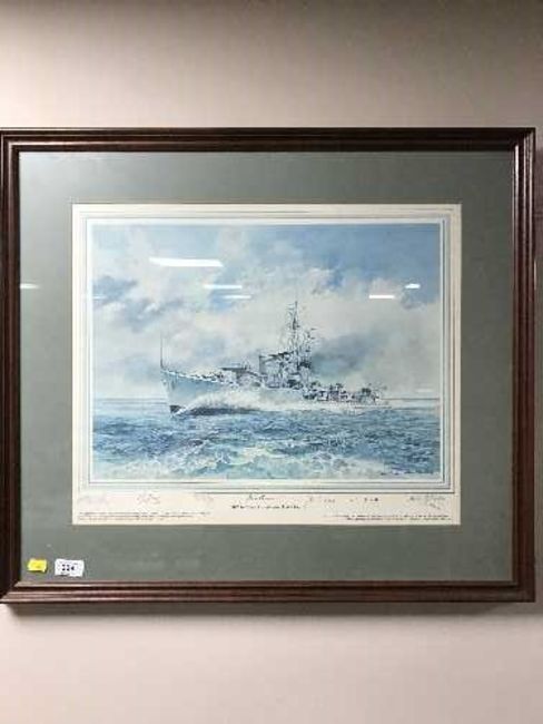 A mahogany framed print of H.M.S. Kelly, Flotilla Leader J & K Class, limited edition 280/750 signed in pencil