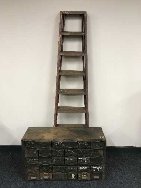 An industrial twenty four drawer metal chest and pair of metal ladders