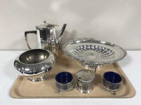 Three piece plated cruet set with liners, plated coffee pot, rose bowl and a Walker & Hall swing handled basket