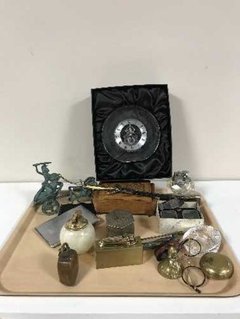 A Dartington crystal clock, Ronson table lighter, paperweights, cigarette cases etc