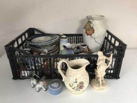 A crate of early twentieth century and later china ornaments and plates, Mason's oak jug, Limoges cow creamers, Goebel toby jug etc.