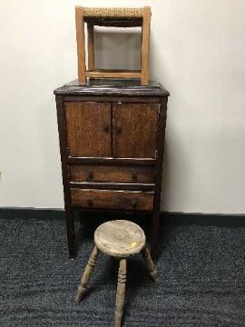 An oak gramophone cabinet and two stools