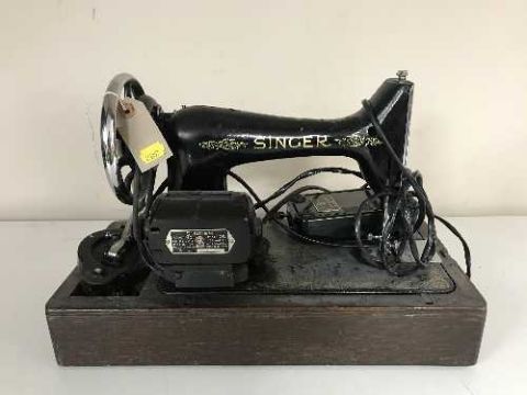 A Singer sewing machine together with two oak rush seated stools and a copper and brass magazine rack