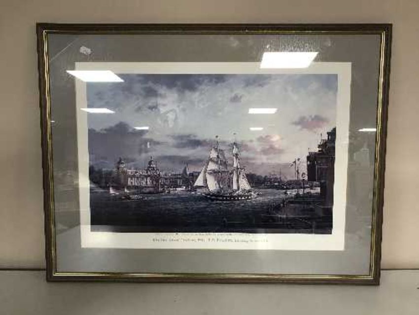 A framed print -Sea Cadet training brig T. S. Royalist passing Greenwich