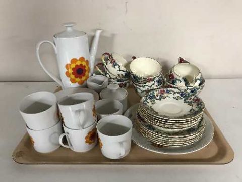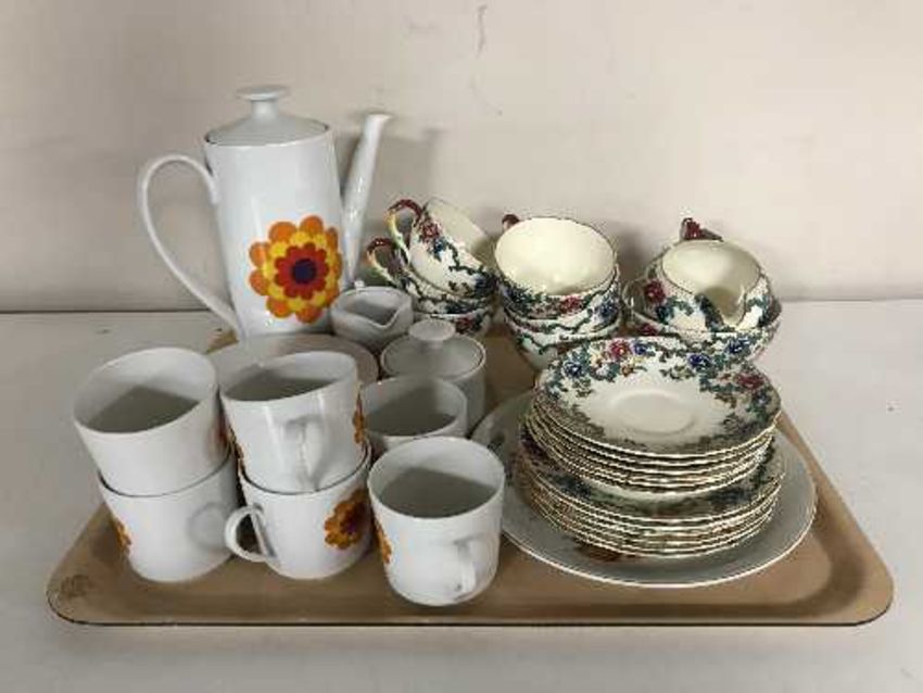 A tray of Maling commemorative plate, Royal Cauldron Victoria tea set, German coffee set