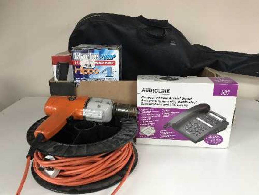 A box of submersible pump, digital radios, drill, acoustic guitar, three LG speakers etc