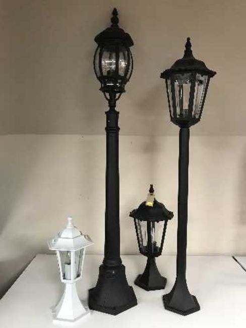 Two electric garden lights together with two garden lampposts