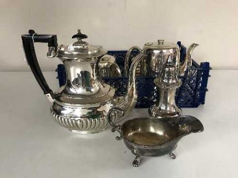 A crate containing a silver plated teapot and other plated wares (Q)