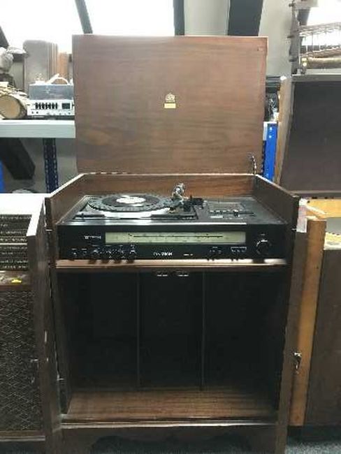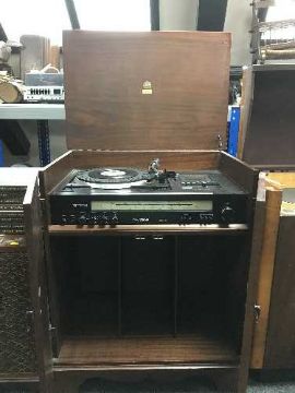 A mahogany cased Dynatron SRX32 turntable with speakers together with a set of Country music records