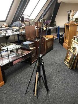 A camera tripod together with a three piece carbon fishing rod with extensions