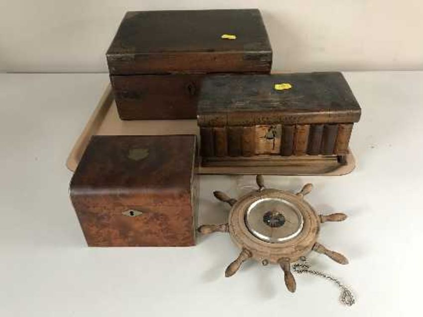 A tray of Victorian writing box, puzzle box, ship's barometer etc