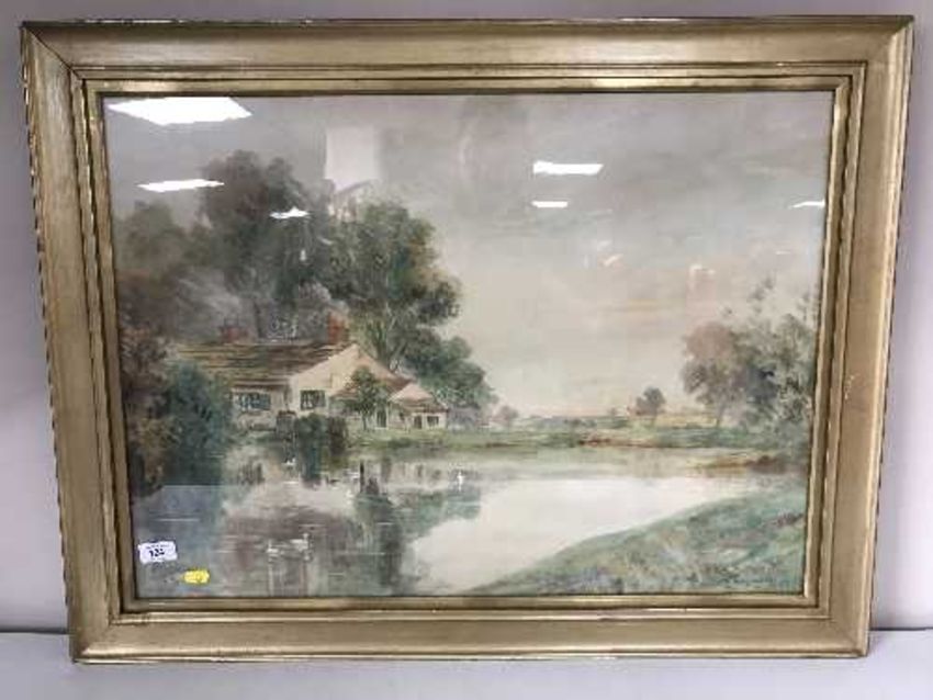 C. F. Wildsmith : Birds on a pond with cottage beyond, watercolour, signed and dated '05, 70cm by 51cm.
