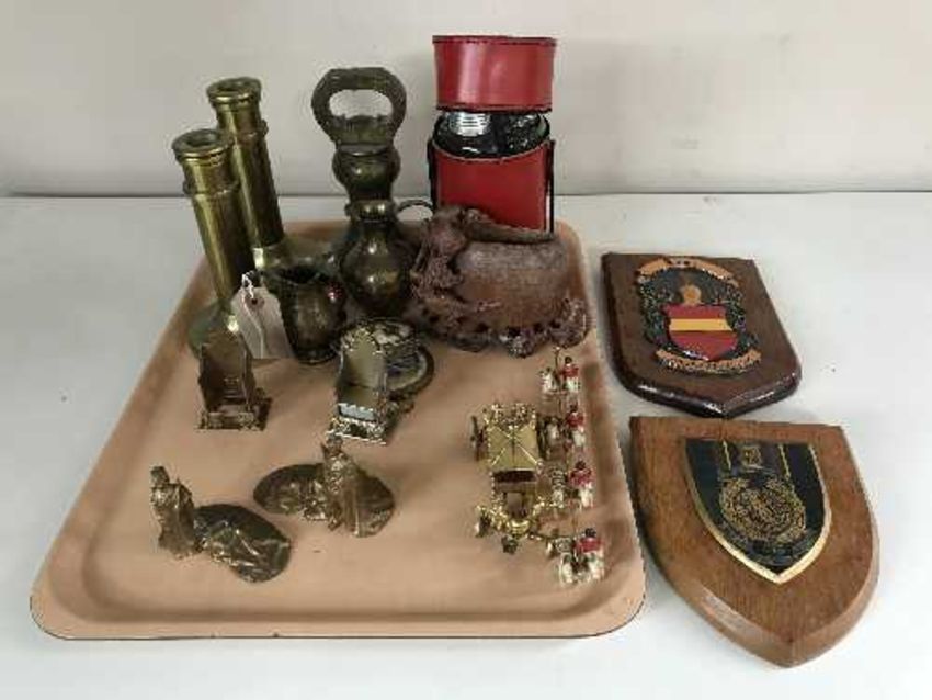 A tray of heavy brass candlesticks, brass weights, hip flasks, wall plaques, together with two lead figures, gilt crescent, horse drawn carriage, soapstone pot etc