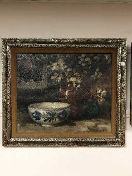 Alfred Joseph Auguste Van Neste (Belgian 1874-1969) : Still life with with pottery on a ledge, oil on canvas, signed, 50 cm x 60 cm, framed.