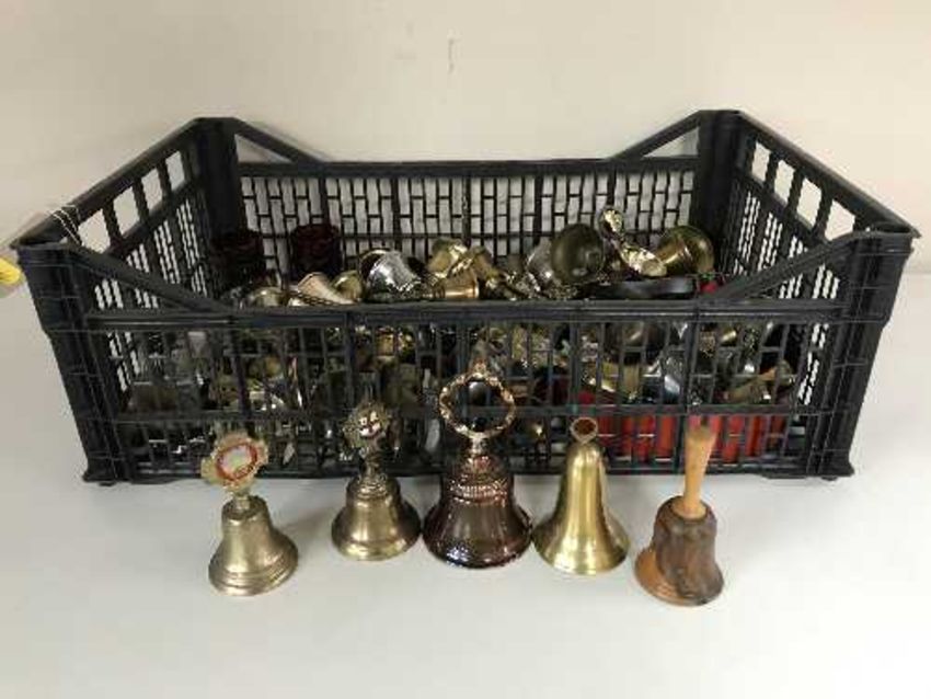 Two baskets of assorted of brass and metal bells - hand bells, wind chimes etc