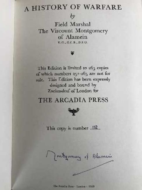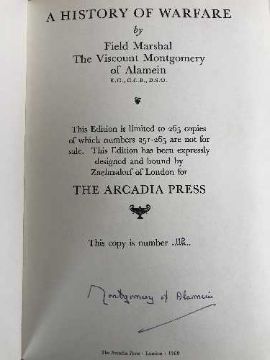 Montgomery (Bernard Law, Viscount Montgomery of Alamein) A History of Warfare, 1969, number 112 of an edition limited to 265, The Arcadia Press, clearly signed in blue ink 'Montgomery of Alamein', original full black morocco by Zaehnsdorf, cannon design to upper cover illustrations in colour and monochrome throughout, a good copy, in a cream clamshell box lined in felt.