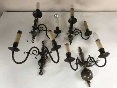 A brass eight branch chandelier together with a box of six pairs of two-way wall lights