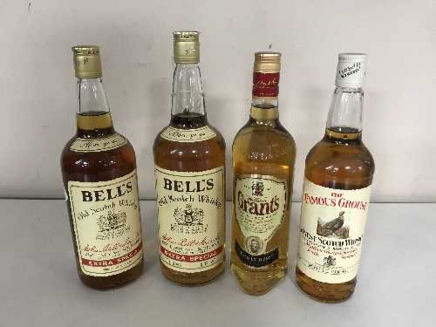 Two one litre bottles of Bells Extra Special Old Scotch whiskey, a 75 cl bottle of Grants Scotch whiskey and a 75 cl bottle of The Famous Grouse Finest Scotch whiskey . (4)