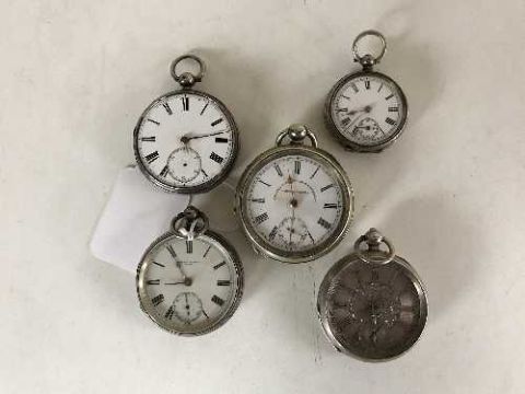 Four silver pocket watches, and a plated example (5)