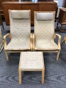 A pair of beech framed chairs in webbing fabric with headrests and a stool
