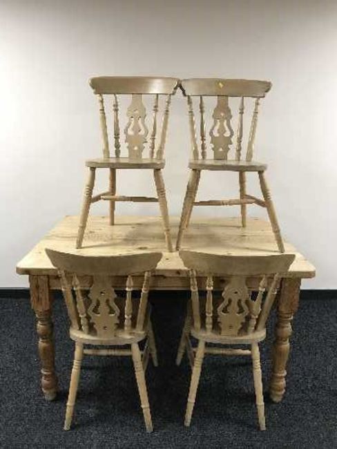 A pine kitchen table fitted two drawers and four chairs