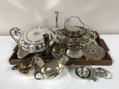 An oak twin handled tray and a quantity of plated ware