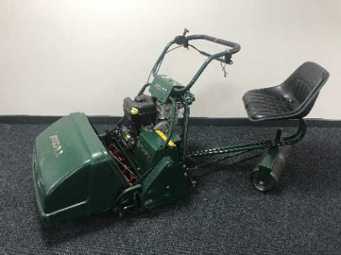 An Atco Royale 24E I-C petrol sit-on cylinder lawnmower, with tow-along seat and collection box.