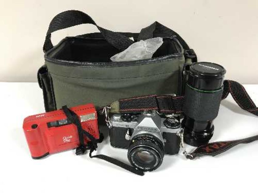 A camera bag containing Pentax ME Super camera, one other camera, lens and accessories (Q)
