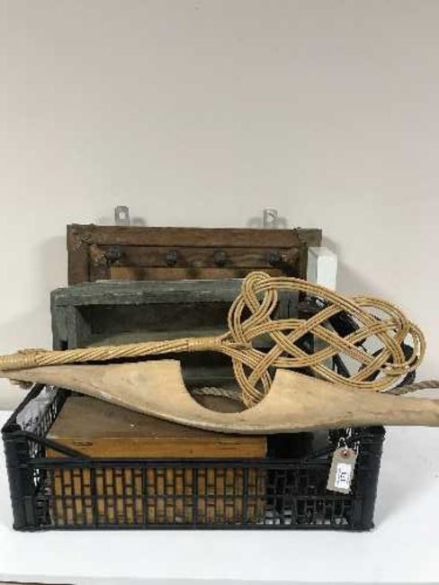A basket of carpet beater, wooden caddy, wooden wall rack, oak table lamp etc