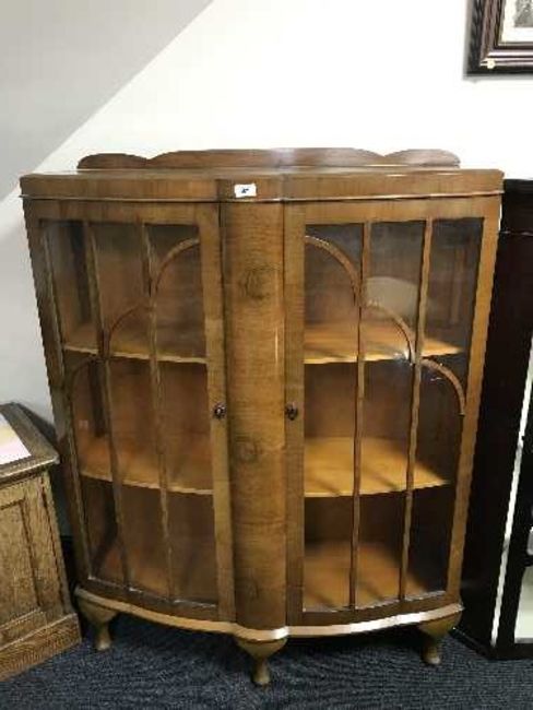 A shaped walnut display cabinet