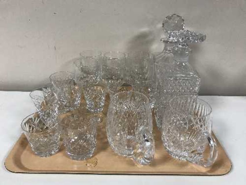 A tray of lead crystal drinking glasses, two decanters and two tankards